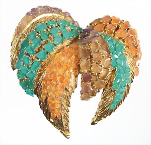 Brosche "FARN", goldfarben, sig.: PANETA (USA), dicht besetzt mit Farbsteinen in Grün,- Braun - u. Orangen Farbtönen (leicht opak), ca. 42,5 x 43,7 mm
