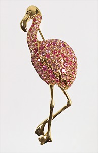 Brosche "FLAMINGO" von D´ORLAN (PARIS), goldfarben, signiert: D´ORLAN, Körber mit reichem Steinbesatz in Pink- u. zarten Rosétönen, H = 69,5 mm, plastisch schön ausgearbeitet !