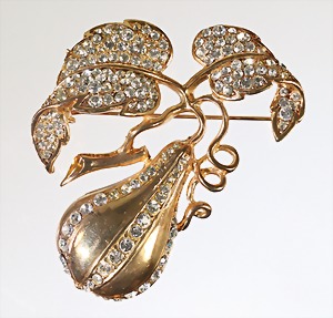 Brosche "BIRNE", goldfarben, von "NINA RICCI" USA, signiert: NINA RICC, zwei Blätter mit Frucht, fast komplett mit weißem Strass besetzt, ca. 53,0 x 71,5 mm