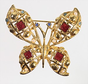 Brosche "SCHMETTERLING", goldfarben, unsigniert, rote Emailleauflage, farbige Strasssteine, kl. Kunstperlen, detailliert gearbeitet, ca. 62,0 x 55,5 mm
