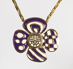 Anhänger "BLÜTE", emailliert, LOUISFERAUD", goldfarben, signiert: Louis Féraud, fröhliches Muster in Blau-Violett und Cremetönen; Kette L = 44,5 cm