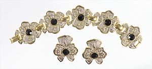 Massives Set: "BLÜTEN", goldfarben, Blütenblätter üppig besetzt mit klaren Strasssteinen, in der Mitte jeweils ein schwarzer, geschliffener Strassstein, Armband; B = ca. 32,5 mm, L = ca. 20,0 cm; Ohrclips H = ca. 37,5 mm