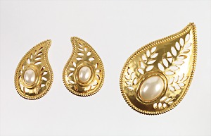 Lot: Brosche u. Ohrclips, "LANVIN" Germany, goldfarben, signiert: LANVIN Germany, tropfenförmig mit ovalen Kunstperlen gearbeitet, Brosche ca. 67,0 x 44,0 mm; 1 Paar Ohrclips ca. 41,0 x 27,5 mm
