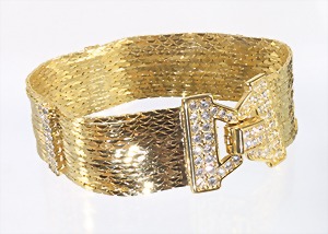 Armband, goldfarben von "NOLAN MILLER" USA, signiert: NOLAN MILLER , 16 Stränge verbunden mit drei Strassbesetzten Stegen (weißer Strass), B = 19,0 mm, L = ca. 19,0 cm