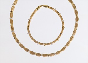 Set: Collier und Armband, von "D`ORLAN" Paris, goldfarbene, signiert: D`ORLAN, zierliche Ausführung in Netz-Optik, jeder zweite Steg ist mit winzigen, klaren Strasssteinen besetzt, Collirt L = 44,0 cm, Armband L = 19,3 cm, Schöner Klassiker !
