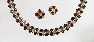 Farbiges Strass-Set (Collier und Ohrclips) von A&S Attwood & Sawyer, signiert A & S, Modeschmuck Designer aus England, üppig besetzt mit roten, grünen und blauen Carre-Steinen, kleine, klare Strasssteine, anschmiegsames Collier mit untergebautem Kastenschloss, L = 42,0 cm; Ohrclips D = 17,0 mm,