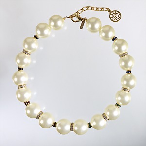 Imposantes Kunstperlen-Collier von Luis Féraud, goldfarben, signiert: Louis Férraud (mit Logo-Anhänger), zwischen den Perlen klare und farbige Strass-Rondelle, D = ca. 20,0 mm, L = ca. 49,0 cm (incl. Verlängerungskettchen)