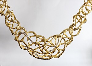 Breites Collier, "ELISABETH TAYLOR", aus der "Treasured Vine"-Serie, goldfarben, signiert ELISABETH TAYLOR, beeindruckendes Collier mit verästelten, mit Strass besetzten Gliedern, plastisch und formschön gestaltet, vorne H = 56,0 mm, L = 43,0 - 51,0 cm (incl. Verlängerungskettchen), ein absoluter Hingucker !