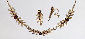 zierliches Set: Collier und Ohrschrauben von "VAN DELL" USA, signiert: Van DELL, plastisch geformte Blätter mit kleinen, runden und größeren ovalen Strasssteinen in einem warmen Braunton, Collier L = ca. 40,5 cm; Ohrschmuck H = ca. 27,0 mm