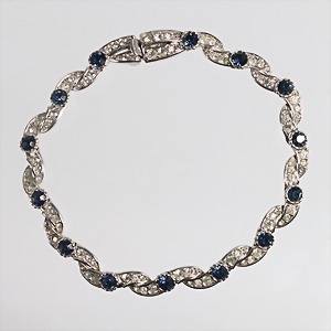 Zierliches Armband, silberfarbene von A&S Attwood & Sawyer, sig.: A&S England, blaue, größere Steinchen und kleinen klaren Steinen, untergebautes Kastenschloss, L = 19,5 cm