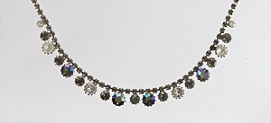 Strass-Collier der Designermarke "WEISS", USA 50er Jahre, silberfarbenes Metall, signiert: WEISS, runde klare und rauchquarzfarbene Strasssteine mit AB-Bedampfung, ehr guter Erhaltungszustand, L = 40,2 cm