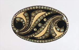 Ovale Emaille-Brosche, weißfarben (Altsilber), unsigniert, eingelassenen Strasssteinen (opalisierend), geschwungenes Muster in Braun- und Erdtönen, ca. 60,5 x 40,0 mm