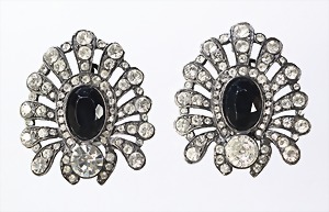 Ohrclips, "ART-DECO" von "SCHERRER" Paris, signiert: Scherer Paris, silberfarbenes Metal, geschwärzt, klarer Strassbesatz, in der Mitte je ein geschliffener, schwarzer Stein (facettiert), H = 43,5 mm