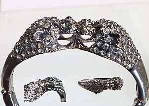 Altsilberfarbene Armspange (unsigniert), zwei Pantherköpfe mit Strassbesatz in weiß u. schwarz, Kastenschloss mit Scharnierbewegung, innen: ca. 62,0 x 53,0 mm