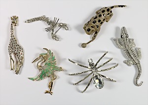 Lot: 6 Broschen, Metall: weiß/gelb, unsigniert, größtenteils mit weißem Strass besetzt, Paradiesvogel mit grün ausgelegten Federn ca. 105 x 74,5 mm; Leopard (schwarzer Emaillelack) u. Krokodil mit beweglichen Elementen; Spinne u. Scorpion komplett ausgefasst, Giraffe H = 130 mm