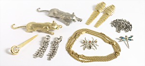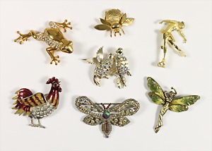 Lot: Modeschmuck, 6 Broschen u.a. 1 "SPINNE"; 2 Katzen; 1 Libelle; 2 Paar Ohrhänger u. 1 Kette
