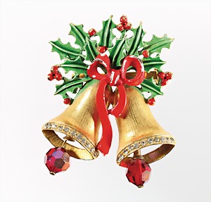 Brosche "GLOCKEN", gelbfarbenes Metall, sig.: WEISS, weißer Strass, Silex-Schleife in rot u. grünem Emaillelack, ca. 39,7 x 50 mm (Schleife mit Fehlstellen)