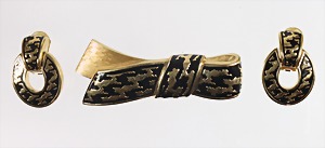 Lot: Brosche u. Ohrclips von "DIOR", gelbfarben mit schwarzem Emaillelack, sig.: Chr. Dior (GERMANY), Brosche "SCHLEIFE", ca. 78,9 x 31,3 mm; Ohrclips (beweglich), H = 35,3 mm