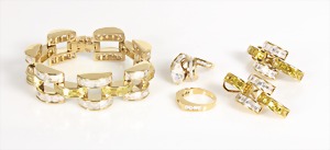 Lot: hochwertiger Modeschmuck, Amerika 1970er Jahre, Silber vergoldet, 1 Armband, weiße u. gelbe Baguettsteine in halbrunden Bögen eingefasst, integriertes Kastenschloss mit 2 Sicherheitsachten, B = 17,5 mm, L = 17,5 cm; 1 Paar Ohrclips (mit Stiften) im gleichen Stil, H = 42 mm; 1 Ring, mit weißem Strass, zentral ein großer Tropfen, seitlich Baguettes u. runde Steine, RW ca. 51,5, ein zweiter Ring kann separat dazugesteckt werden !