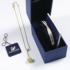 Lot: Swarowski Schmuck (signiert), 1 Armreif weißfarben mit transparenten Swarowskisteinen, Kastenschloss u. Scharnierbewegung, innen ca. 59,0 x 46,0 mm; Anhänger "KUGEL", gelbfarben mit weißen Steinen ausgelegt, H = 40,5 mm, Kette L = 38,5 - 44,0 cm (Verlängerungskette !)