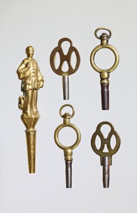 Lot: Taschen-Uhrenschlüssel, 4 Stk. (einfach), L = 27,8 - 37,5, 1 Stk. verg. "JUNKER" mit Glas u. Weinflasche, L = 57,5 mm