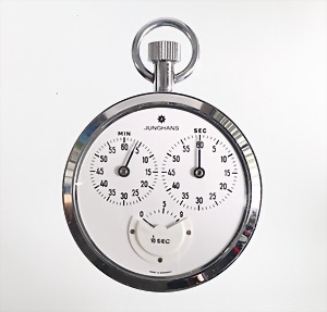 Sport-Stoppuhr, "JUNGHANS", weißes Z.B. mit arab. Zahlen, gebl. Zeiger, Stahlgehäuse, ged. Boden verschraubt, MIN., SEC., 1/10 SEC, guter/sehr guter Zustand, in Originalkarton, D = 55,0 mm