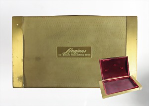 Uhrenschatulle "ART-DECO 1920/30er Jahre, "LONGINES", graphisch gestaltetes Mesinggehäuse, formschönes Art-Deco, innen mit rotem Samt ausgeschlagen, Boden relieffiert, ca. 138 x 80 x 27,6 mm