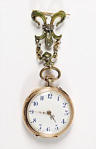 Damen-Taschenuhr, "JUGENDSTIL" um 1900, GG 585/000, Emailleziffernblatt mit blauen arab. Ziffern, goldfarbene Minutenpunkte, sehr feine Zeiger, rückseitig: grün u. schwarzes Emaille (dezente Fehlstellen), Staubdeckel: Metall, D = 29 mm, Uhr läuft, feine Jugendstilarbeit ! Dazugehörig: Brosche Frankreich, "JUGENDSTIL" um 1900, GG 750/000, transluziedes gelb/grünes Emaille, gouillochiert, 9 Diamantrosen, ca. 19,7 x 37,3 mm, Aufhängung für Taschenuhr, sehr feine Jugendstilarbeit !