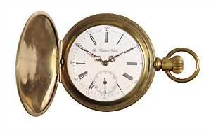 Herren-Sprungdeckel-Taschenuhr, 1910/20er Jahre, goldfarben, röm. Index, Minuteneinteilung, kl. Sek. Auf 6 Uhr, gut erhaltenes Emaille-Zifferblatt, sig.: The Vigilant Watch, Ankerhemmung, ornamentierte Oberfläche (stilisierte Pfauenfedern), D = 54,3 mm, Uhr muß überholt werden !