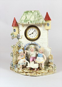 Porzellan-Uhr, wohl Schlesien/Böhmen, reich bemalt und verziert, lieblich Szene mit drei Kindern u. zwei Gänsen, einfaches Steckwerk, H. 27,0 cm, Uhr läuft