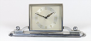 Tischuhr, "ART-DECO" der 1930/40er Jahre, Zeiger mit Leuchtmasse, arab. Zahlen, Gehäuse drehbar (verchromt), Werk mit Wecker, Wecker von hinten einzustellen ! ca. 25,0 x 10,5 cm, Uhr läuft !