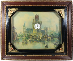 Bilderuhr, "MELANCHE", Flußszene mit Kirche u. Turm (Bild gedruckt), Turmuhr mit Emaille-Ziffernblatt, röm. Index, Werk mit Pendel, Glas bemalt, Rahmen mit Resten alter Vergoldung (Leisten teilweise mit Fehlstellen ), Maße: ca. 72 x 60 x 9,5 cm