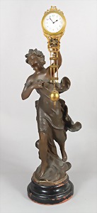 Mysterieuse "SCHWINGPENDELUHR", "JUGENDSTIL" um 1900, Metallguss bronziert, sig.: Hip Moreau (1832 -1927), vorne auf Holzsockel, L´AURORE, H = 56,5 cm (incl. Uhr), Junghans 8-Tagewerk, weißes Emaille-Zifferblatt, arab. Index, Minuteneinteilung, H = 56,5 cm (incl. Uhr)