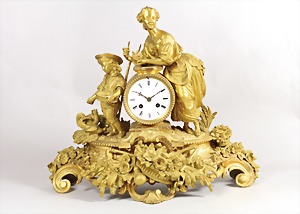 Französische Pendule um 1870/80, Bronce vergoldet, "MUTTER mit KIND", weißes Emaille-Zifferblatt (kl. Abplatzer), röm. Zahlen, ½ Std. Schlag auf Glocke, das Kind füttert die am Boden pickenden Hühner, die Mutter hält ein Nest mit 3 kleinen Vögeln, auf dem Gehäuse sind: eine Sense, ein Dreschflegel u. eine Heugabel harmonisch integriert, der Sockel ist üppig mit Blüten u. Ähren verziert, H. ca. 41,5 cm, Uhr läuft ! (Glocke fehlt)