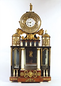Wiener Prunk-Pendule 1.Hälfte 20. Jhd. mit ¼ Std und Std.Schlag auf Drahtgong, auf Mahagonie gebeiztes / ebonisiertes und teilbronciertes Holzgehäuse mit vergoldeten Applikationen, zwei zentrale Alabastersäulen. Über den seitlichen Spiegeln befinden sich zwei Kapitelle mit stilisierten Engeln. Oben bildet eine kl. Bronzefigur "PHILOSOPH" den Abschluss. Seitlich am Uhrengehäuse stehen zwei antike Krieger (Automaten) und schlagen mit einem Hammer auf einen symbolischen Drahtgong. Die Figuren sind fein ausgearbeitet. Emaille Ziffer-Blatt (kl. restaurierte Stellen) mit röm. Zahlen. Das Pendel, dessen Abschluss ein Engel u. eine Muse bildet, spiegelt sich in den dahinterliegenden Spiegeln wieder. Am Boden feine Bemalung. Einige kleine Applikationen fehlen, kl. Restaurationsarbeiten wurden durchgeführt, 1 Spiegel mit Riss, Oben im Gehäuse 1 Spannungsriss, H. 61,0 cm, sollte vom Uhrmacher durchgeschaut werden !