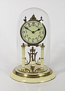 Jahresuhr, Glashaube, elfenbeinfarbener Kunstoff-Sockel mit, Messingring, bemaltes Emaille-Ziffernblatt, arab. Zahlen, Glashaube H = 28,5 cm, Uhr läuft, (Gehäusefuß an zwei Stellen eingerissen)