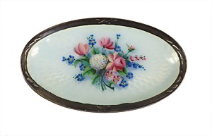 Kleines Schälchen, "BLUMEN"- Bukett, Pforzheim um 1900/10, Silber 835/000, transluzides Emaille, gouilllochiert, 79,3 x 46,0 mm