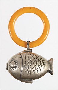 Kinderrassel "FISCH" 1940/50iger Jahre, Silber 835/000, honigfarbener Bakelitring D = 45,2 mm