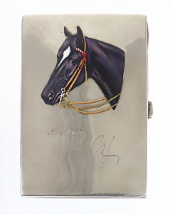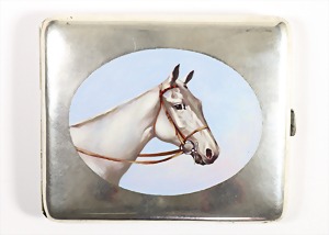 Zigaretten-Etui "PFERDEKOPF", 1920/30er (wohl Pforzheim), Silber 835/000, innen feuervergoldet, feine Emaillearbeit mit Pferdekopf, graviert: 16.2.1955, Maße: ca. 100,0 x 70,8 x 11,5 mm. Solche Silberwaren fertigten u.a. Carl Schwitzgabel (Pforzheim)