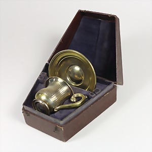 Becher mit Teller, "BIEDERMEIER" um 1830/50, Silber 13 Lot mit alter Vergoldung (berieben), umlaufend feine Wellenlinien, Henkel außen etwas eingedrückt, Monogrammiert: Alison, H = 7,3 cm, passend kl. Teller, D = 12,1 mm, dezent verziert, gut erhaltene Originalschatulle !