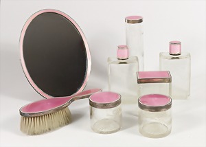 8-teiligeToillettengarnitur, Frankreich um 1900, Silber, sig.: JM, gepunzt: Minervakopf aber auch Sterling, Rosafarbenes, transluziedes Emaille, Untergrund fein gouilllochiert, 1 Bürste L = 20,0 cm; 1 Spiegel mit Aufsteller, ca. 22,1 x 16,2 cm; 1 rechteckige Dose, H = 8,0 cm; 2 runde Dosen mit Deckel, H = 6,0, D = 5,8 mm (1 Deckel mit sehr dezentem Chip); 2 Flacons nit Glasstöpsel u. Deckel (1 Stöpsel fehlt, 1 Deckel mit Chip), H = 12,3 cm; 1 längliches Gefäß, L = 17,0 cm, D = 4,0 cm, 1 Glas an einer Ecke mit Chip, alle Gläser umseitig mit Blumendekor u. Schleifen verziert (feine Gravur !)
