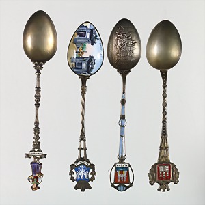 Lot: 4 Löffel um 1910, Silber 800/000, aufwändig emailliert (teilweise beidseitig), 1 x Harzburg; 1 x Köln; 2 x Gosslar u. 1 Löffel, Metall, Frankfurt, L = 12,2 - 13,4 cm