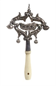 Kinderrassel um 1820/30, Silber/Bein, zentral eine kleine Wiege mit einem Kind (schwenkbar), vollplastisch ausgearbeiteter Rahmen, seitlich mit 4 Schellen verziert, der aus Bein gearbeitete Griff ist formschön integriert u. dient gleichzeitig als Pfeife mit einem zarten Ton, H = 16,5 cm, B = 9,1 cm, absolute Rarität ! Sammelwürdig !