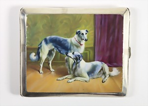 Zigarettenetui um 1910/20 wohl Pforzheim, ALPACCA, innen Feuervergoldet, Emaille farbig bemalt, zwei "HUNDE" in einem herrschaftlichen Flur, ca. 97,2 x 80,0 x 17,0 mm, kräftige solide Ausführung !
