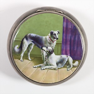 Dose um 1910/20 wohl Pforzheim, ALPACCA, innen mit Resten alter Feuervergoldung, Emaille farbig bemalt, zwei "HUNDE" in einem herrschaftlichen Flur, D = ca. 82,5 mm, H = 33,3 mm, kräftige solide Ausführung !