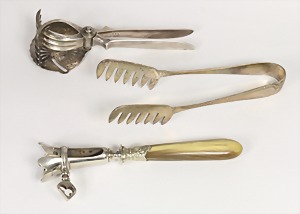 Lot: 1 Keulenhalter mit Horngriff, L = 21,0 cm; 1 Halter "ZITRONENPRESSE" von "CHRISTOFLE", gebogene Zinken, durchbrochene, verzierte Platte, L = ca. 20,0 cm; 1 "SPAGHETTI"- Zange, Silber 900/000, sig.: AK 900, L = 21,0 cm