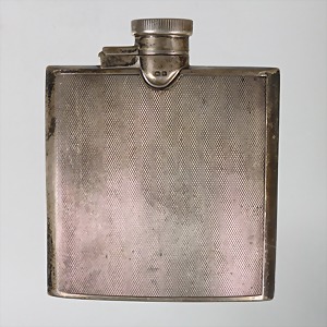 Flachmann, "BIRMINGHAM" 1934/35, Sterlingsilber 925/000, sig.: W.N LTD, Bajonett-Verschluss (Bügel mit Scharnier), Oberfläche strukturiert, ca. 82,5 x 99,0 x 14,2 mm, leicht gebogen, total ca. 108,5 g