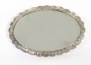 Spiegel 1930/40er Jahre (Vorderasien), Silber 900/000, vorne mit gepunzten Ornamenten, Rückseite mit Blumenmustern reliefartig gestaltet, Kette zum Aufhängen, ca. 30,5 x 21,8 cm, total ca. 1,3 kg, (seitlich an 2 Stellen eingedrückt)