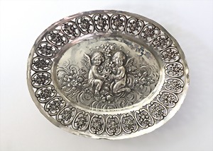 Silberschale, Hanau Anfang 20.Jhd., Silber 800/000, 2 ENGEL/PUTTI" im Blumenbouquet (reliefartig ausgearbeitet), ca. 18,5 x 15,0 cm, total 146,3 g