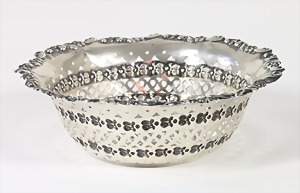 Silberschale, "BIRMINGHAM" 1906/07, Sterlingsilber 925/000, sig.: J.G (Joseph Gloster), floral ornamentiert u. mit Durchbrüchen gestaltet), D = ca. 14,8 cm, total 98,0 g, (Rand mit leichten Dellen, 1 kl. Riss !)